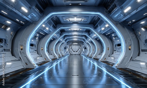 未来的な宇宙ステーションの廊下、輝く通路、幾何学的なデザイン