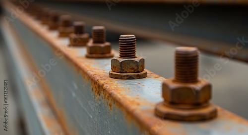 錆びついた鉄骨に規則正しく並ぶ複数のボルト写真