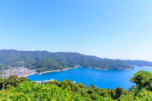 愛媛県伊方町の三崎港を見渡す夏の絶景。青い海と緑の山々、澄んだ空が広がる風景。