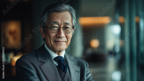 japanese, man, aged, suit, vest, cravat, shirt, smile, thumb, gesture, office, lobby, glasses, art, background, focus, backlight, professional, manager, potency, experienced, security, construct, texture, balance, depth, closeup, classic
