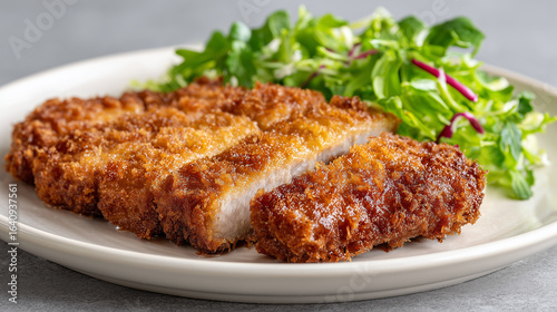 ジューシーで厚切りの豚肉にサクサクの衣をつけた食欲をそそるトンカツと新鮮なグリーンサラダ