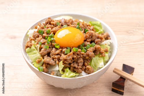 pork, pig, mince, miso, miso, dish, food, bowl, rice, ground meat, meat, green onion, green onion, bowl, lettuce, yolk, egg