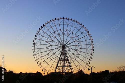 ferris wheel, blue skies, gondola, sky, date, gradation, funfair, braces, summer, season, spring, yen, window, leisure, spinning, couple, family, view, vehicle, fun, flow, park, tour tourism, showplace, silhouette, tokyo, city, facility, golden hour, dusk, copy space, space, evening, sunset, tourist attraction, landmark