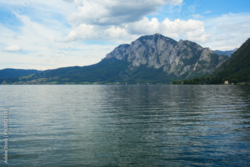 austria, lake, nature, landscape, view, landscape, grandeur, grandiose, immensity, vision, tour tourism, travel, tourist attraction, showplace, outdoors, leisure, vacation, water sport, ship, boat, kayak, fishing, mountain, mountain chain, water, fresh water, water surface, lakeshore, shore, town, sky, blue skies, cloud, season, spring, european, europa, central europe, copy space