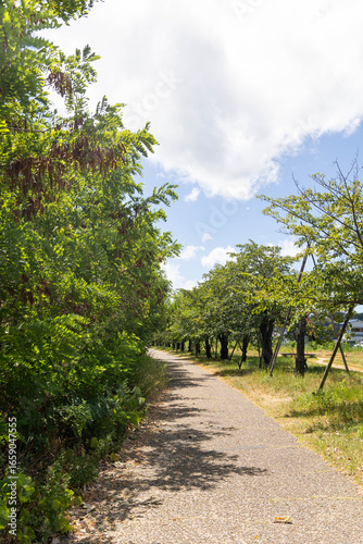 wood, walk, cycling, bike, health, image, walk, exercise, osaka, stream, cherry tree, landscape, blue skies, nature, sunny, japan, green, route, milky way, walking, course, promenade, live, improvement, break, bench, square, daytime, copy space, material, clean, running