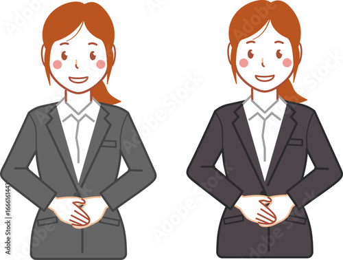 グレースーツ、ポニーテールの手を前で重ねる若い女性