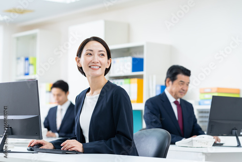 office, business, middle-aged, japanese, people, corporation, corporate, office, office, personal computer, desk, table, suit, employee, woman, man, waist up, face, work, work, copy space, staff, team, fellow, colleague, indoor, career woman, businessman, seated, look up, computer, woman, teamwork, smiling, smile, corporate