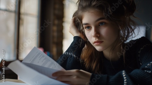woman, black hair, long hair, brood, unrest, embarrassment, concentration, document, table, indoor, reading, document, contract, bill, learning, work, casual, background, analysis, peace, workspace, seated, concentration, woman, student, computer, notebook, personal computer, school, business