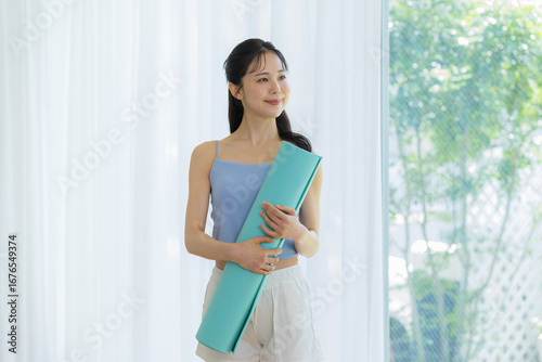 yoga, smile, exercise, diet, possess, gymnastics, woman, exercise, indoor, room, life, home, lifestyle, portrait, cosmetic, health care, beauty, fitness, house, window, training, relax, smile, beauty, health, copy space, indoor, sport, pursuit, stand, home, homemaker, people, japanese