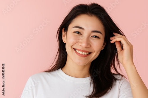 woman, asian, young, smile, portrait, pink, background, lovely, happy, fun, enjoyment, affirmative, feeling, rendering, person, face, head, hair, long, black, brunette, skin, skin, pretty, white, shirt, casual, fashion, style, cosmetic, health, lifestyle, optimistic, light, hope, glamour, female model, advertisement, commercial, promotion