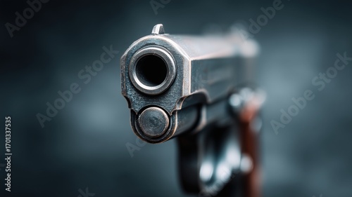 銃口を正面から捉えた迫力ある写真。武器や防犯関連の素材として活用可能なイメージ。