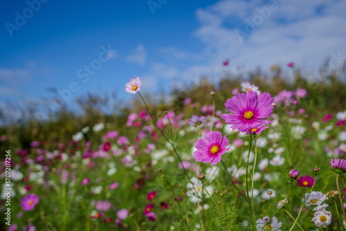 plant, fall, hill, blue skies, cloud, tour tourism, tourist attraction, red, red, landscape, flower, nature, sunny, full bloom, sky, open air, showplace, japan, cosmos, white, pink, pink, field, pitiful, pretty, colourful, flower garden, flower petals, lovely, bloom, light, clean, sweet
