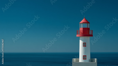 青空の海で白波に囲まれた赤白の灯台塔堂々と