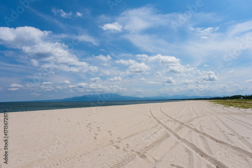 砂浜が延々と続く弓ヶ浜海岸から大山を眺める