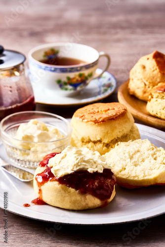 紅茶とともに楽しむアフタヌーンティーのスコーン。クロテッドクリームとジャムを添えて味わう伝統的な英国風ティータイムの一場面。ティーポットやカップと共に並べられたスコーンは、洋菓子、デザート、カフェ、休日のひとときを表現する素材写真として利用可能。