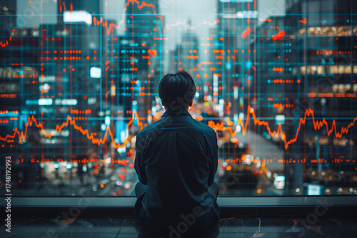 夜の都市を見下ろすビジネスマンと経済チャートが描く金融の未来