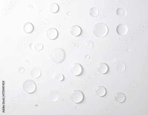 白背景に水滴が浮かぶ清潔感と高級感のあるミニマル抽象デザイン