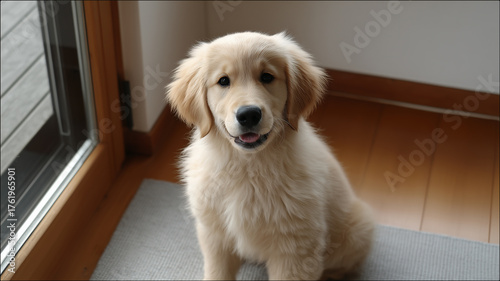 ゴールデンレトリバーの子犬が日差しの差す窓際で穏やかに座る場面