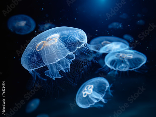暗い深海のような空間を漂い青白く発光して泳ぐクラゲの幻想的な海中風景