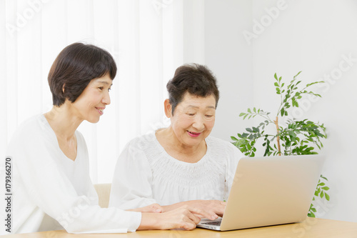 aged, age, elderly, nanny, babushka, woman, aged, aged, grandmother, grandmother, elder, waist up, room, living room, indoor, indoor, house, home, lifestyle, personal computer, notebook, mail, cyberspace, spend, smile, middle-aged, homemaker, mother, mother, mother, search, net, japanese, smile, asian