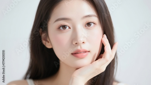 woman, cosmetic, japanese, skincare, hand, jaw, touch, skin, asian, young, white background, studio, portrait, closeup