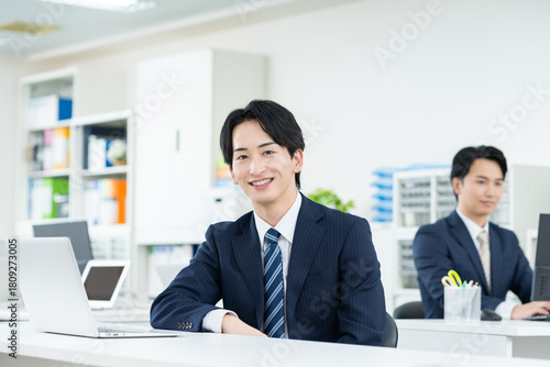 businessman, office, business, man, young, newcomer, suit, cravat, desk, table, waist up, face, indoor, corporation, corporate, office, office, copy space, work, work, personal computer, notebook, people, japanese, employee, salaried employee, seated, smile, computer, smiling, person