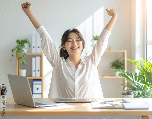 オフィスでストレッチをしてリラックスする笑顔のビジネスウーマン。明るいワークスペースで達成感を感じる働く女性のポジティブなテレワーク風シーン