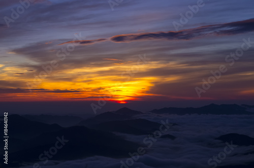 sky, cloud, sun, sunrise, orange, nature, landscape, red, blue, light, yellow, heaven, mountain, sea, morning, sunlight, fuji
