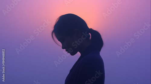 woman, japanese, profile, silhouette, ponytail, brow, nose, lip, jaw, neck, shoulder, shape, shadow, light, background, morning, sky, purple, pink, peace, blank space, attitude, waist up, clothes, neck, black, shape, construct, people, hope, mind, afterglow, time, dawn, brilliancy, luminance, tenderness, feeling