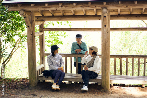 自然の中で休憩しながら会話を楽しむ女性達