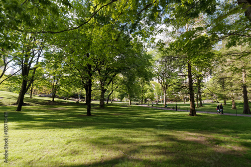 central park, verdure, green, summer, new york city, landscape, view, building, highrise, america, manhattan, shadow, sky, daytime, blue skies, cloud, lawn, shopping centre, pathway, shade, travel