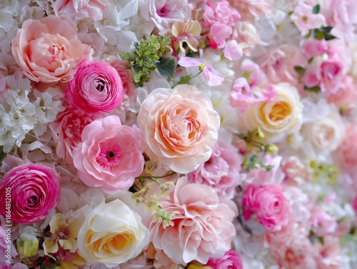 春色の花々が優しく重なり合う華やかで上品なフラワーアレンジメント背景