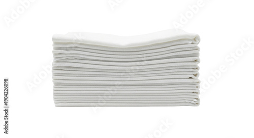 白いコットンタオルの折りたたみスタック、柔らかいテリー生地のテクスチャ、清潔感のあるリネン補充イメージ、白背景