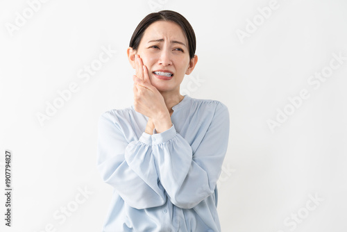 portrait, people, person, woman, woman, japanese, japan, asia, young, 30s, black hair, shirt, sky blue, blue, blue, teeth, toothache, cary, wisdom tooth, dentist, health, poor health, marode, negative, arduous, trend, clean, lovely, pretty, white background, indoor, indoor