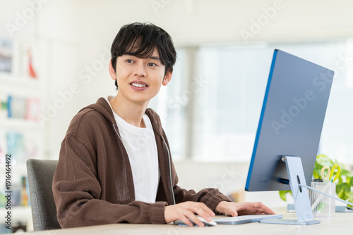 engineer, personal computer, man, office, young, smile, designer, japanese, people, desk, work, work, waist up, face, indoor, copy space, casual, business, corporation, employee, table, office, venture, businessman, office, portrait, mouse, keyboard, input, operation, search, seek, examine, programmer, seated, person