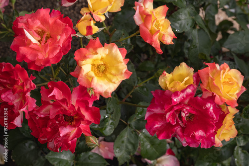 色鮮やかなオレンジと赤のバラの競演
