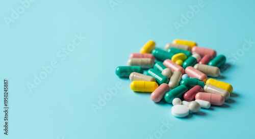 カラフルな錠剤が鮮やかに散らばる、医療と健康を象徴する美しいイメージ
