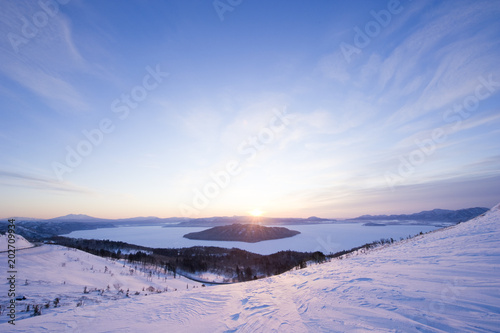 morning sun, hokkaido, sunrise, sky, winter, landscape, morning, snow, nature, water, cloud, sun, blue, lake, mountain, cold, white, sea, lovely