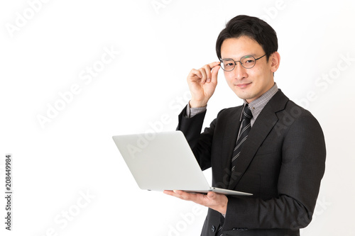 man, people, salaried employee, businessman, glasses, glasses, long hair, personal computer, notebook, suit, cravat, alone, 30s, work, business, smile, portrait, good-looking, japanese, asian, chinese, white, cut-out, background, copy space