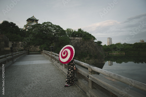大阪城と和傘をさしている着物女性