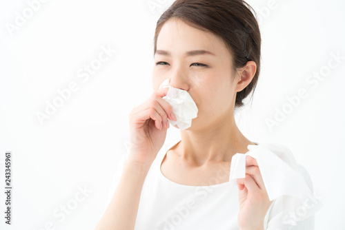 hay fever, woman, girl, tissue, woman, nose, snot, allergy, cry, bite, people, alone, white, white background, waist up, lifestyle, health, cosmetic, marode, dislike, young, adult, homemaker, student, japanese, asian, korean, chinese, taiwanese, indoor, indoor, spring, arduous, stern, sniffle, rhinitis, cold, flu