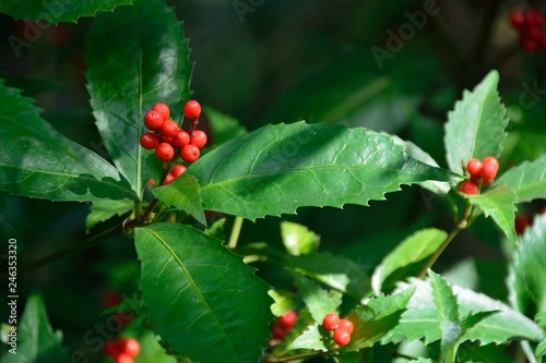 赤い果実をつけたセンリョウ