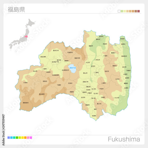 福島県の地図(等高線・色分け・市町村・区分け)