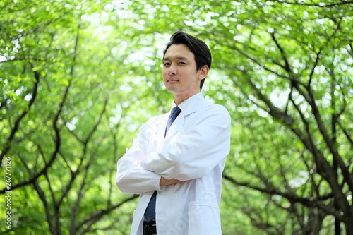 ポージングをする男性医師 信頼 新緑の公園 二十代 三十代