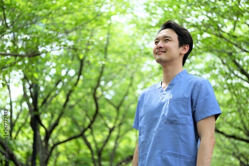 people, man, asian, doctor, future, copy space, portrait, young, lad, alone, japanese, nurse, midwife, physical therapist, hygienist, academy, college, medical care, medicine, study, learn, dream, hope, future, effort, cool, pretty, smile, confidence, park, verdure, green
