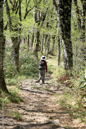 禿岳登山道のブナ林を歩く女性
