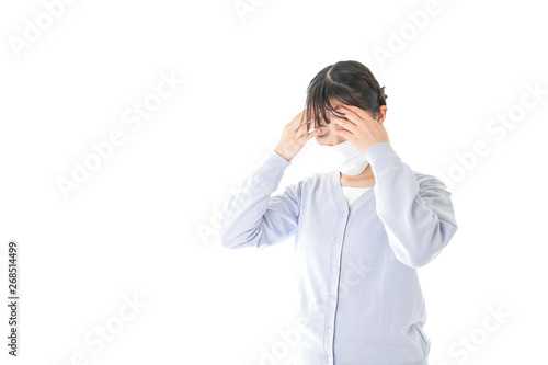 cold, heat, mask, cough, throat, pain, fever, thermometer, cephalalgia, temperature, marode, poor health, hospital, clinic, insurance, burden, sudden change, fatigue, fatigue, sneeze, stress, virus, microbe, immunity, emergency, medicine, measure, young, woman, asian, japanese, chinese, korean, white background, copy space