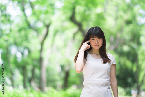 woman, verdure, relax, refresh, 30s, lifestyle, young, green, people, cosmetic, skincare, beauty, skin, face, health, adult, green, japanese, asian, pretty, clean, exercise, open air, refreshing, t-shirt, youth, alone, contemplate, smile, smile