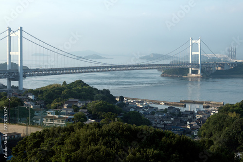 bridge, sea, sky, morning, human settlement, town, building, port, transportation, route, way, rail, suspension bridge, view, landscape, blue, sunny, travel, tour tourism, june, mist, big, long, construction, seto inland sea, japan