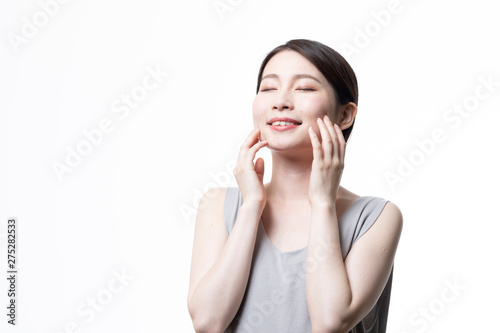 copy space, skincare, beauty, waist up, people, pretty, woman, indoor, indoor, japan, japanese, white, white background, dazzling, clean, beauty, cosmetic, skin, young, face, black hair
